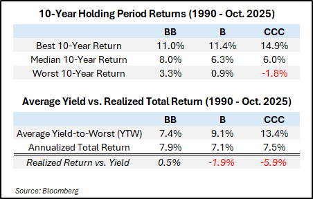 The shift toward higher-quality BB-rated bonds signals a change in the overall risk profile of the high yield asset class. Historically, the lower rated segments (B and CCC) have been the primary drivers of the asset class’s default rate of ~2.5% per year since 2001. Default experience varies significantly by rating: BB-rated bonds have averaged annual defaults of just 0.4%, compared with about 2.0% for B-rated bonds and more than 6.0% for CCC-rated bonds. Despite offering lower yields, BB-rated bonds have generated stronger long-term risk-adjusted returns, as their lower default and loss rates have more than offset their yield disadvantage. Therefore, as the overall percentage of BB-rated issuers has increased, one would expect the future returns of the asset class to also improve due to lower default rates and lower credit losses versus the historical long-term average.