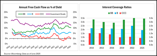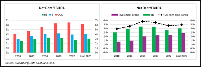 Leverage tells a similar story. BB-rated issuers have seen only a modest increase in leverage, with net debt/EBITDA rising from roughly 2.5x in 2010 to about 3.0x in June 2025, compared with a rise from 3.0x to 4.0x for B-rated issuers and from 4.0x to 6.0x for CCC-rated issuers. This widening gap is even more evident when viewed across the high yield market as a whole, where overall leverage now stands near 3.5x, about one turn higher than investment grade issuers, whose leverage has nearly doubled from 1.3x to 2.4x over the same period.