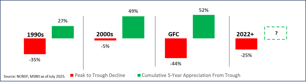 In the 1990s, an overhang of excess supply and risky CRE lending depressed pricing and transaction activity for several years. Recovery required banks to repair balance sheets, time for excess supply to clear, and cap rates (percentage yield generated by a property calculated by dividing net operating income by the property value) to compress over multiple years. The early 2000s decline was less of a systemic shock and more driven by the dot-com crash. Markets and sectors with higher tech concentration saw sharper declines, but the overall trough was relatively shallow.